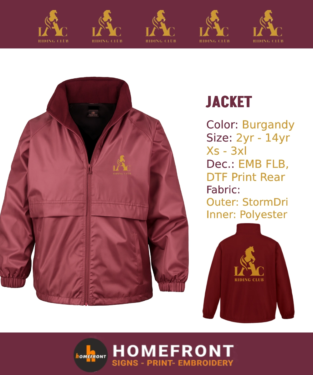 The LAC Riding Club Jacket is the ideal outerwear solution for those needing reliable protection, style, and personalised workwear all in one. Built for performance in unpredictable UK weather, this adult jacket features a StormDri PU-coated polyester outer shell that offers waterproof protection up to 2000mm while remaining lightweight and breathable. A cosy 180gsm microfleece lining in both the body and sleeves ensures warmth and comfort during colder rides, training sessions, or daily wear around the stables. Designed with a windproof finish, this jacket keeps you shielded from the elements without compromising on movement or style. It’s available in a full-size range and crafted for durability, making it a trusted staple for riding clubs, schools, and businesses that value both function and appearance.